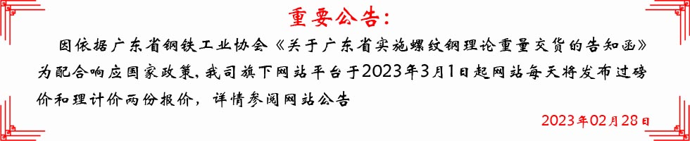 廣州鋼材批發(fā)網(wǎng)(網(wǎng)址:www.i36g.com),每天公布的鋼材價(jià)格行情,是由廣州鋼材市場(chǎng)大的批發(fā)商提供的。對(duì)廣州鋼材市場(chǎng)給本站報(bào)價(jià)大的批發(fā)商的經(jīng)營(yíng)情況、信譽(yù),也是經(jīng)我們網(wǎng)站考察論證過(guò)的。我們公布的鋼材價(jià)格行情,是鋼材供應(yīng)商從批發(fā)商處進(jìn)貨的實(shí)際價(jià)格。未含運(yùn)輸、吊機(jī)費(fèi)、人工、利息等費(fèi)用。對(duì)每天公布的價(jià)格行情的公正性、真實(shí)性,本網(wǎng)站同意負(fù)責(zé)。但有下列情形者,我們都不予以負(fù)責(zé)。